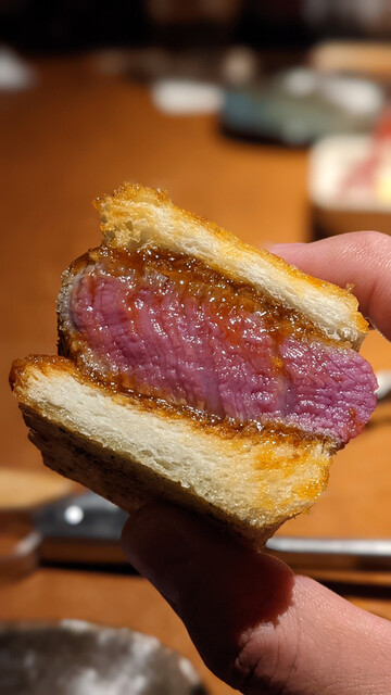 →セントルザベーカリーの食パンのヒレカツサンド。薄い衣と均一な火入れで仕上げたヒレカツに甘めのセントルザベーカリーの食パン相性よく、過去一のヒレカツサンドでした。