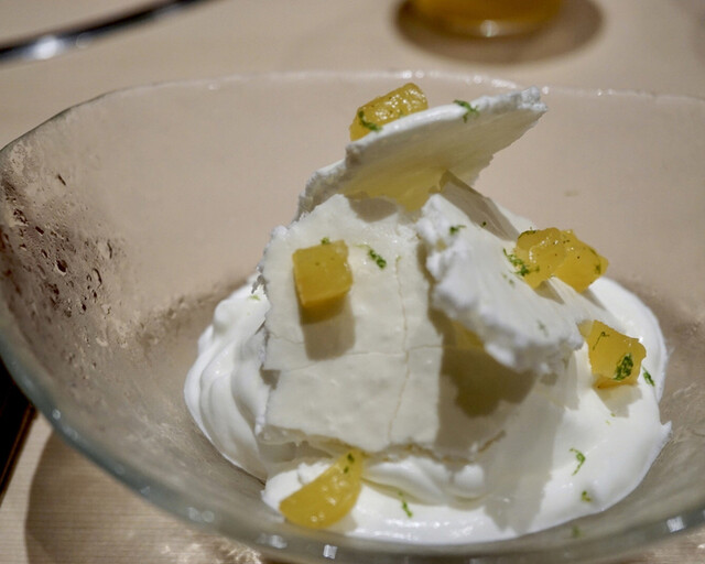 中身はパッションフルーツ、マンゴー、ライチ、ライムのシャーベット、マンゴーの香りをうつしたクリーム、ココナッツのメレンゲ、ソテーしたマンゴー、最後に柚子皮を削っています。ココナッツのメレンゲのサクサク感とマンゴークリームがとても美味でした。