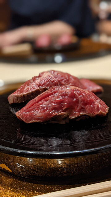 →三者三様の肉寿司でした。ハラミ叩きは旨味たっぷり。サーロインはトロトロでしっとりの口当たり。牛トロ寿司は雲丹とのハーモニーを楽しめました。