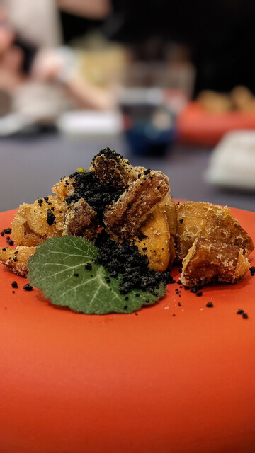 中骨やアラと乾燥させた夏のキノコ10種類前後のエキスをGV注入しフリット。マガタミアナッツを擦ってる