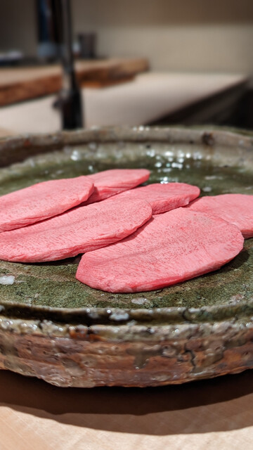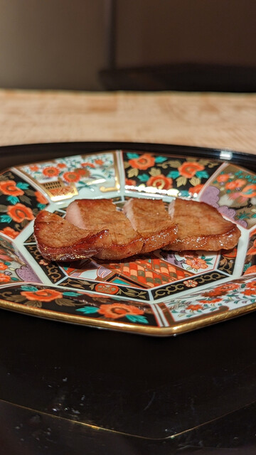◇白桃の白和え ウイスキー樽の木で焼いた牛タン