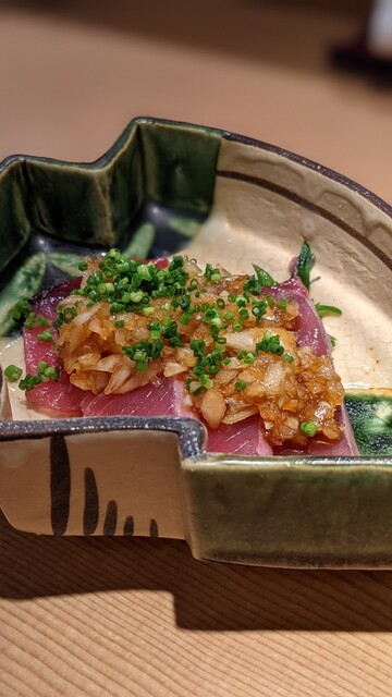伝説の鮨職人長野氏の二番手を7年ほど務めた後に、滋賀「しのはら」(現在は銀座)、京都「祇園さゝ木」でも日本料理の研鑽を積み、「東麻布天本」として独立。