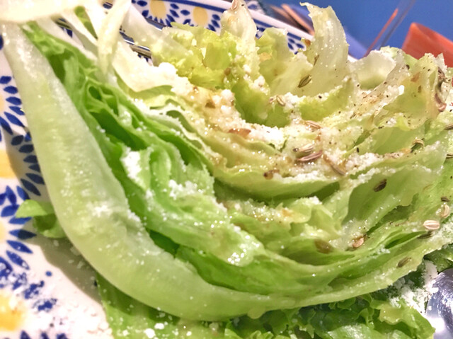 ハイカロリーサラダは名前に惚れた! 無条件オーダー。3分の1玉ほどのレタスに、ペコリーノチーズが山ほどかかっていて、溢れた分をスプーンで掬って乗せて食べる。はちみつと胡椒とビネガーもかかっていたかしら。ワクワクするお味。