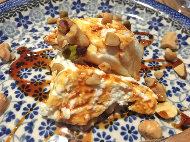 リコッタチーズのデザートは、ナッツとキャラメルソースの味が効いてて最高。シンプルな構成なのに、ここまで美味しいとはさすが。