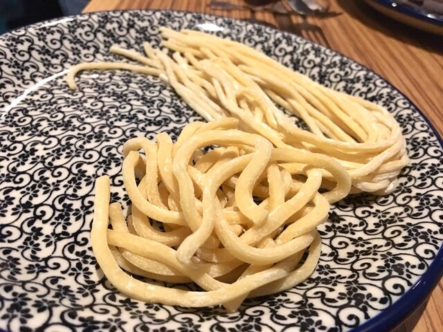 黄色いイワシのソース 極太麺は、今夜のわたしのナンバーワン。太いパスタは、浅草開化楼とロットチェントの共同開発で生まれた低加水生パスタ。モチモチでコシがあり、麺類を食べる幸福を具現化している。ストレートに美味しい! 黄色いイワシのソースは生臭みが全くなくて肉のよう。この香りはサフラン? 攻めてくる味わい。遠慮なしに美味しい。