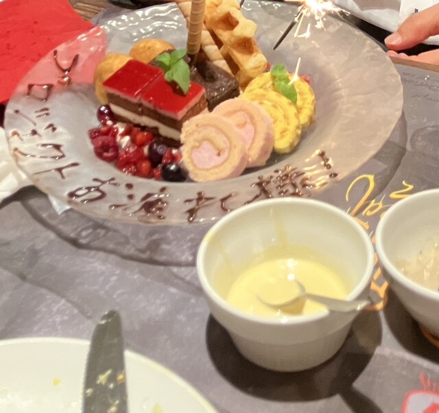 花火とミュージックでプロジェクトお疲れ様のコメント入り!デザート盛り
