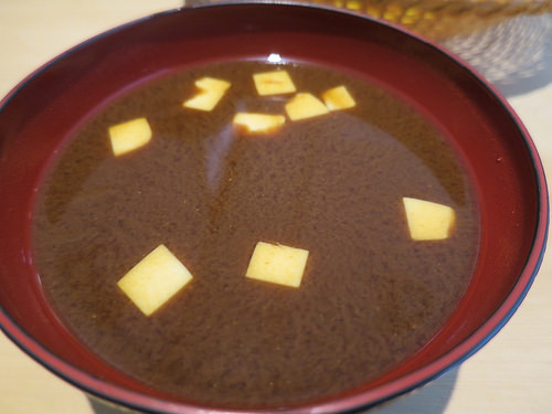 こちらがセットの味噌汁です。赤だしのいい匂い。味噌汁って癒やされますね♡おにぎりと合う。