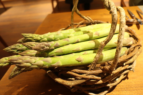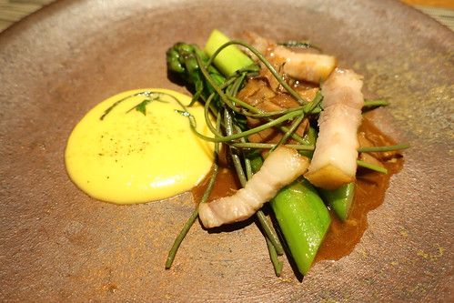 ☆グリーンアスパラガスオランデーズソース妻有ポークタンの煮込みベーコン木の芽(あけびの新芽)