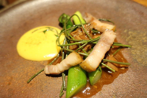 なんか前菜からもうお洒落でテンション上がりますね!八色椎茸と濃厚なクリームチーズのようなものをサブレでサンドしたもの。これが面白い!食べたことないような味わいでなんだか癖になります。あまどころという山菜を生ベーコンでくるんだもの。あまどころは、初めて食べましたがシャキシャキした食感で、少しアスパラのような甘さもあり、モチモチした塩気のあるベーコンと相性抜群です!