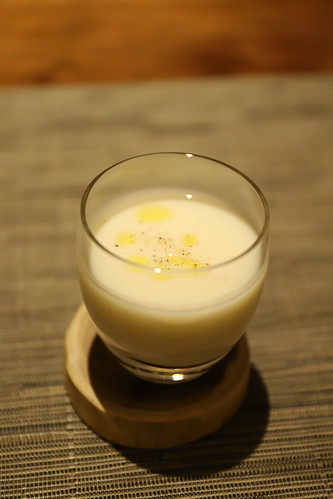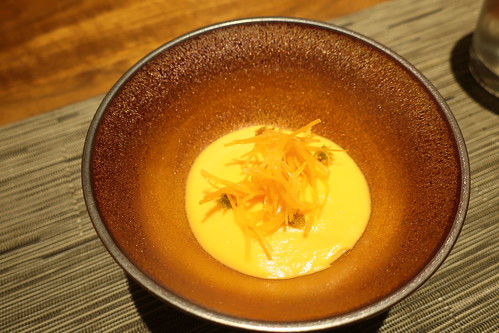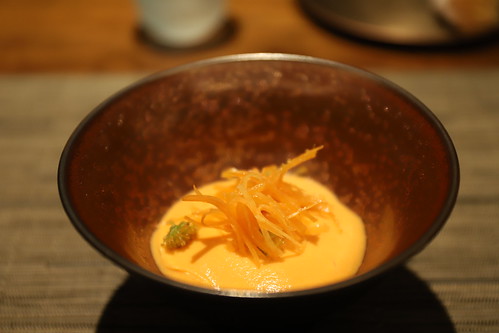 雪下人参のムースって初めて食べましたが、ふわっと上品な甘さで癖になりますね。雪下人参の下には、ふきのとうが隠れてました。少し苦味のある、ふきのとうと雪下人参の甘みがマッチしていて最高です。さらに下にはコンソメのジュレと南蛮海老が登場!プリプリで甘味があり、コンソメジュレとサッパリした味わいが相性抜群です。