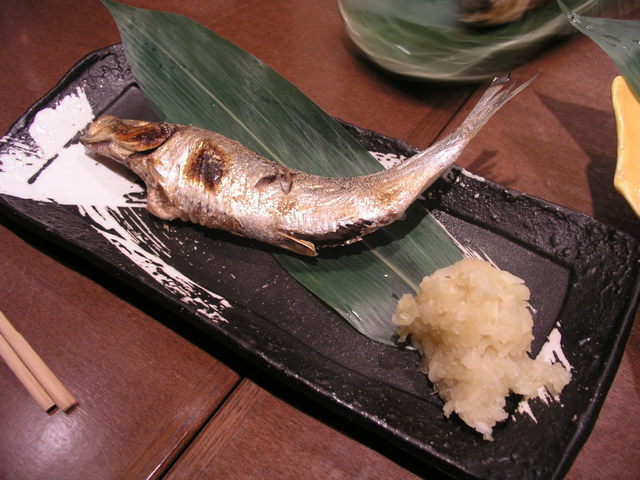 目の前で棒に刺さったお魚が焼けていくのを見れます。魚に大リアクションで塩をふりかけている店員さんも見れます。