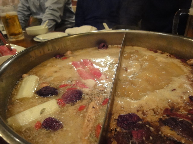 スープは中央でしきられていて、赤いほうが辛くて白いほうが辛くない、というのは説明しなくてもわかりますよね…。