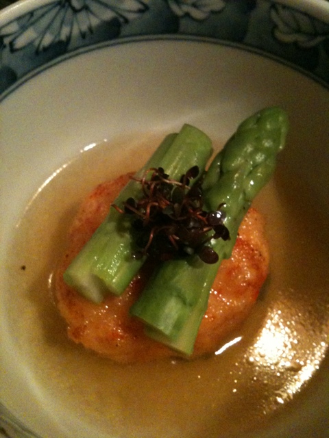 芝えびの風味・甘みが十分でています。グリーンアスパラに紫芽がトッピングされていましたが、紫芽は彩?よくわかりません(/_;)