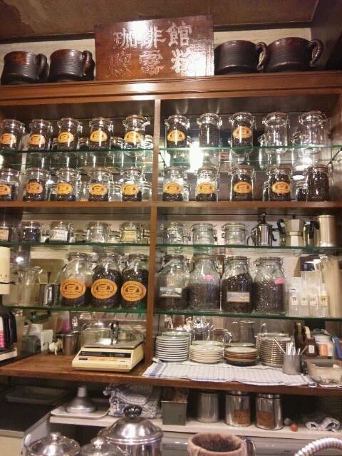 ⇒カウンターとテーブル席があるが、圧巻は、カウンター席の前にはぎっしり珈琲豆がズラリ!