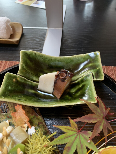 海老芋 タコ柔らかに 秋の彩炊き合わせ 鯖寿司 栗 楓をあしらったせんべいなど