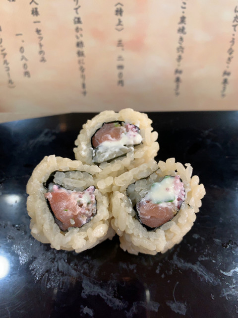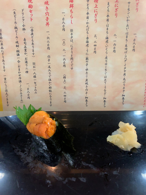 一、にぎり 鮃、中とろ、縞鰺、水蛸、紫雲丹軍艦、数の子、赤海老、焼き穴子、干瓢裏巻き