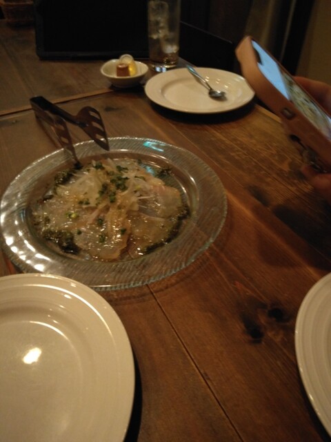「タイのカルパッチョ」 これは「本日のカルパッチョ」とのことなので、その日に仕入れた筋の良い魚をカルパッチョにしていると思われる件。素材を活かしたアッサリしたビネガー系ソースが刮目ものの仕事をしている。