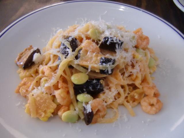 下の写真は、連れが注文した小海老と夏野菜のトマトクリームの自家製手打ちパスタ。