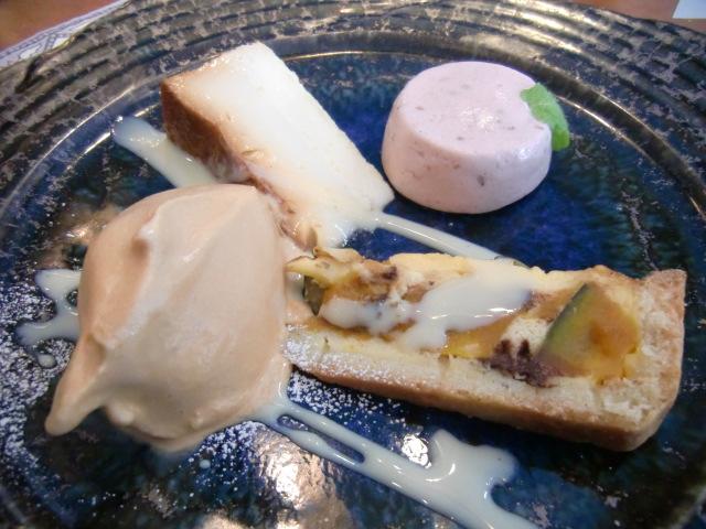 写真の右上から時計回りで、イチゴとゴマのムース、カボチャのケーキ、塩キャラメルのジェラート、卵白のプリンです。