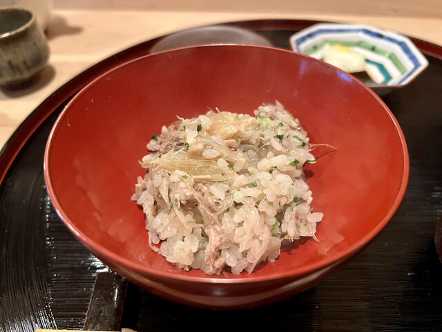 ご飯の上に炭火で焼いた白子を乗せ、柚子で包み込んだ美しい一品。かき混ぜていただくと、これがもう絶品の一言。柚子の香りがふんわり心地よいです。