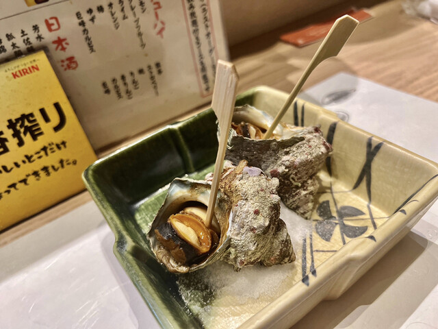 その後は、生ホタルイカの刺身、鰹の塩たたき、なめろう、サザエの壺焼きとテンポ良く提供されます。