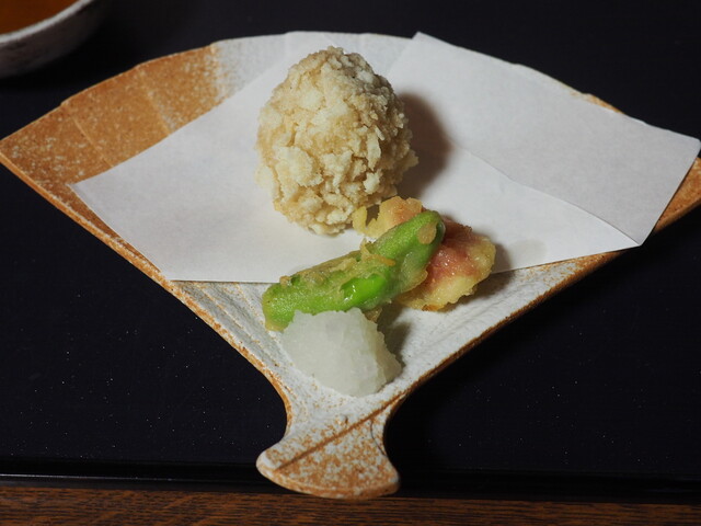 白木のカウンター席でいただきましたが、奥には緑のキレイな坪庭が見えるお座敷席もありました。