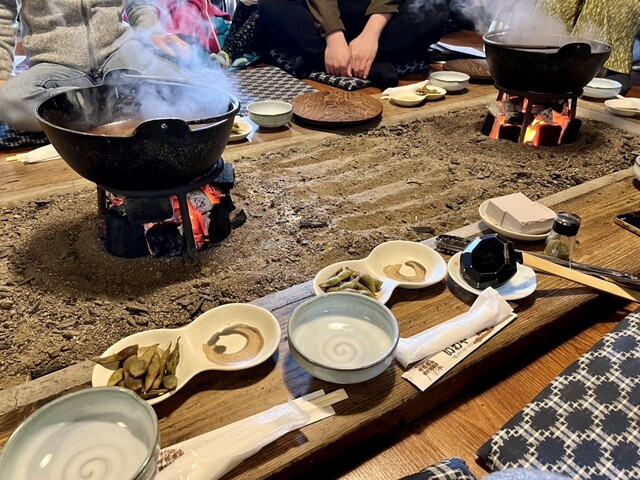 雰囲気のある囲炉裏で絶品ぼたん鍋と美味しいお酒…