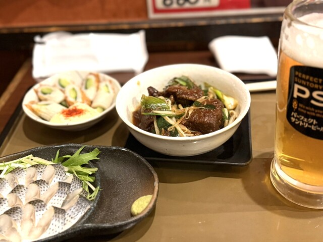 刺身(小肌系),ちくわきゅうり,レバニラ,生ビール(パーフェクト中)