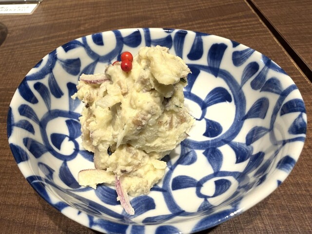 前回の引き続き頼んだ,わさびといぶりがっこのポテサラ の わさびも良い感じで聴いており,アルコールが進みます.