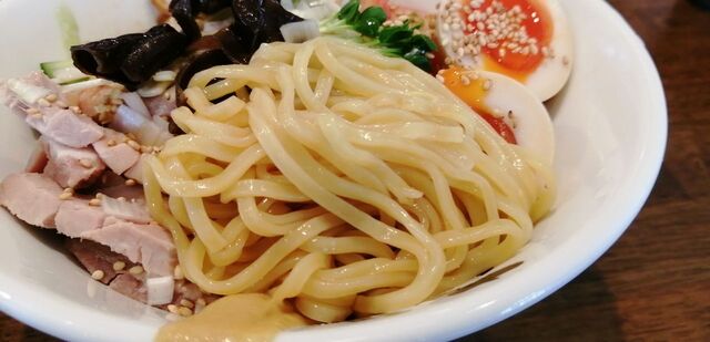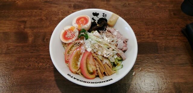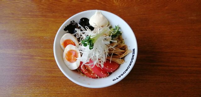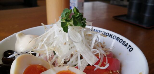 トッピングは玉子、キクラゲ、トマト、キュウリ、チャーシュウ、ネギの上にカイワレ、そして白ゴマパラパラ。
