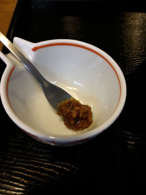 「良かったらコレをお試しください」と。店員の勧めで自家製でしょうか?辛味噌も付いてきました。麺を食べ終えて、つゆに混ぜて飲み干しました。久しぶりに美味しい蕎麦を食べた気がしました。