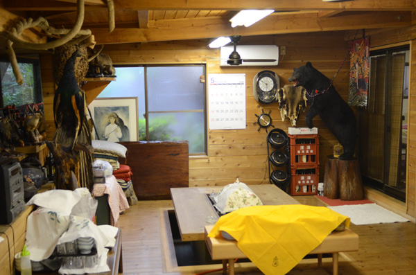 熊を初めとする剥製たちがが客を迎えてくれます。掘りコタツのテーブル席がいいですね。
