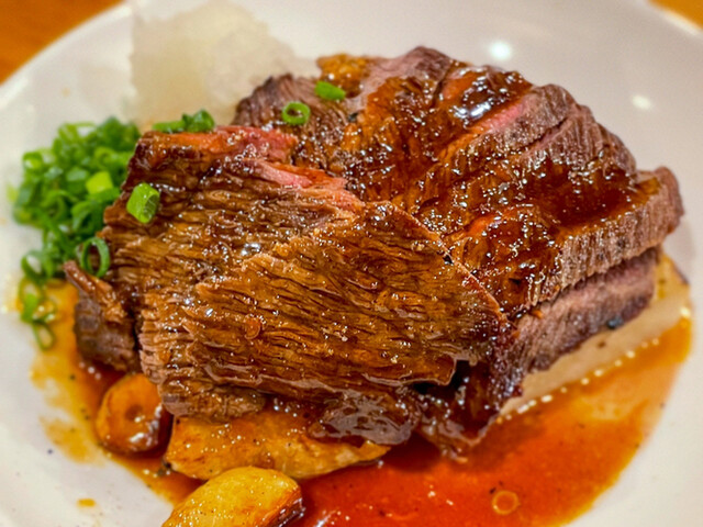 惣菜用にいいイチボ肉をかなり仕入れたと聞いたので、それで料理をしてもらうことにしました。出てきたのは300グラムほどの立派な和風イチボカットステーキと大根の煮物。お肉は柔らかくて超うまい!ソースもなかなか。大根はちょっと固め。