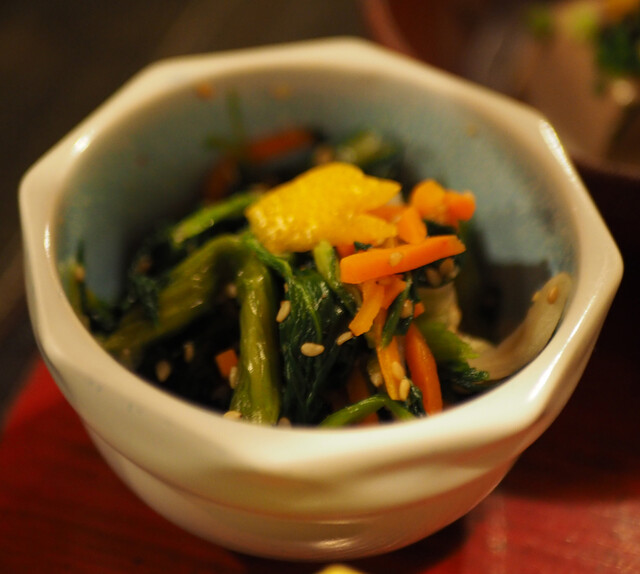 その後、茹で海老や魚の切り身を焼いたもの、卵焼きなど甘さと塩味のコントラストを楽しみます。豆腐は自家製なのかよくわかりませんが上に魚の卵が乗っておりなかなかうまい。