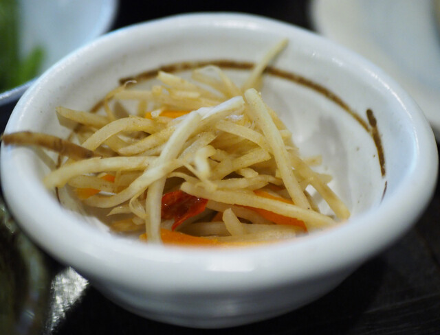 辛子蓮根は三角形っぽい形状で、かなり小振。これまでの宿泊先では大きな円形のものを1/4にカットして出てきますが、こちらは小さくても周り全体にコロモがついてるので良い感じです。