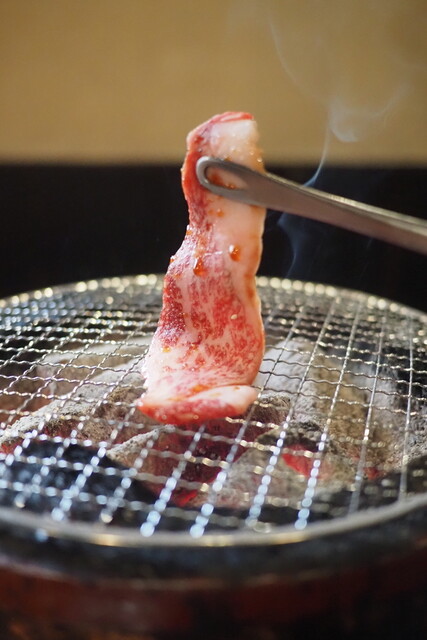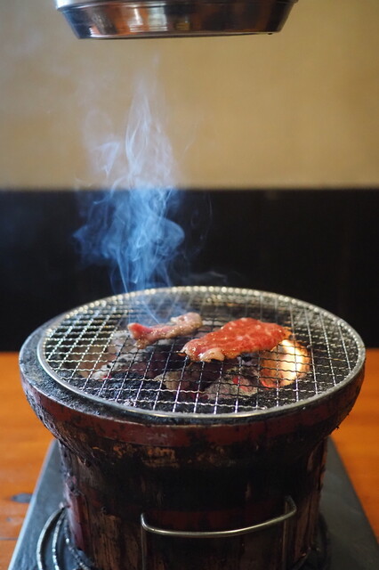 当然、200gに方を注文。正直、かなり安いです。走行しているうちに、七輪が登場!炭を贅沢に使っており、おひとりさまランチでこれは、かなり贅沢です!元取れるんだそうかとふと疑問。出てきた肉は、量の多さに圧倒されました。真っ赤な肉がうまそうです。肉は適度に霜降り状の脂が乗っておりものすごくうまい!生玉子は解いて、すき焼きのようにして食べます。これが意外といけます!スープは変哲のない韓国風ワカメスープですが、不満は一切なし!