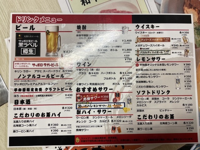 メニューを開くと、どれも信じられないほど安い。特に「平和園カルビ」は500円以下とは思えないクオリティで驚きました。注文はスマホからできるスタイルで、古い建物ながらシステムは現代的。サービスもスムーズで、店員さんの対応も丁寧でした。