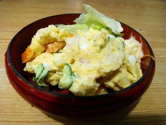 お通しのポテトマカロニサラダ 〜赤いのはニンジン