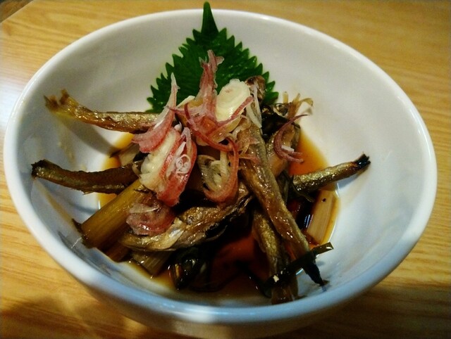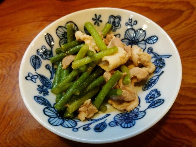 お通しは、ニンニクの茎と豚肉の炒めもの。