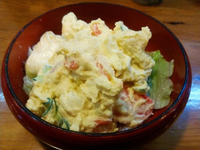 前々回にもいただいた、鶏肉が入ったポテトサラダ。小ぶりレタスとマヨネーズ添え。