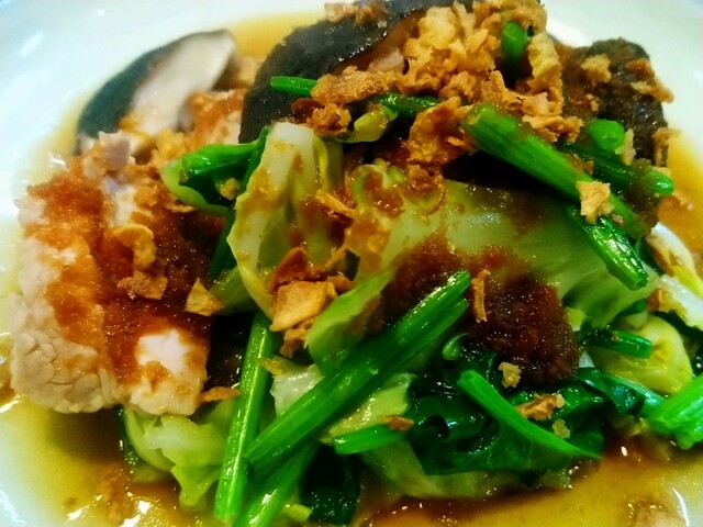 透明の餡の下には、しいたけ、鶏肉、エビ、