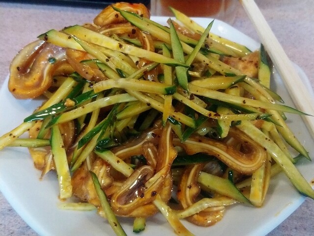 キュウリとともに、イイ具合に味付けられた豚の耳の、食感を楽しむ。