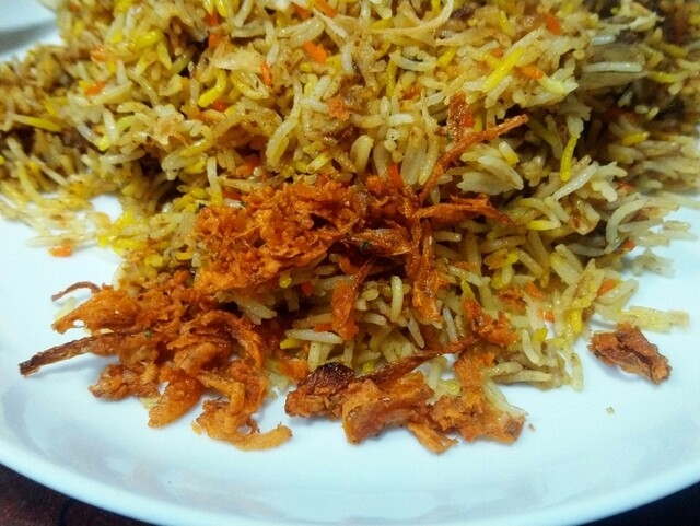 柔らかく調理された牛肉を、ベースのビリヤニにあとから加えたものと思われる。