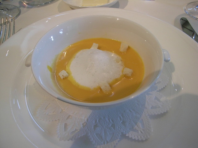 前菜は「フォアグラと鶏胸肉のテリーヌ、シェリー酒風味のジュレ添え、クルミとインゲンのサラダと共に」。私は、フォアグラのテリーヌが、好きなだけに、この前菜は、美味しくいただけた。濃厚であっても、しつこくなり過ぎず、良かった。