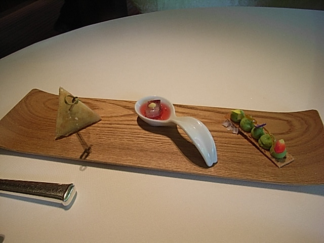 まず、胡麻に刺さったチップスが出てきた。「インカの目覚めチップス」とか仰られていた。続いて、「アミューズブーシェ」。さすがに上品な味で、美味しい。