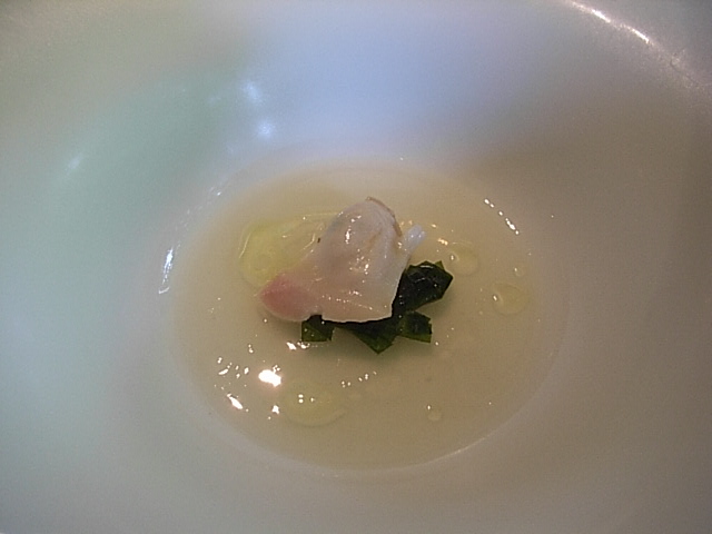 前菜が「雉、フォアグラ、原木椎茸、菊芋の温製サラダ仕立てクルミオイルと長期熟成シェリーヴィネガー風味」。これが、美味しかった。特に雉が、美味しかった。続いてスープが「大根のスープ・スタンダール風」。変わった器でそこの方が熱い感じのスープ。