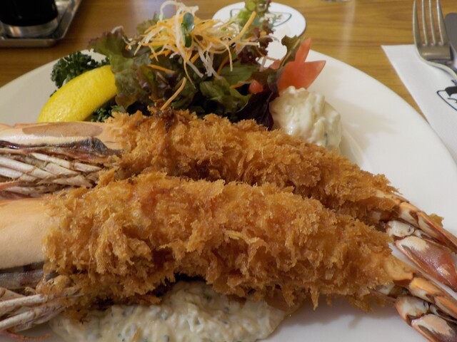 伊勢海老フライが、2尾で、食べ応えがある。伊勢海老は、車海老に比べると大味と言われる。