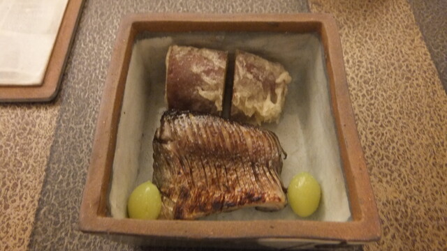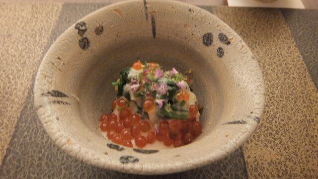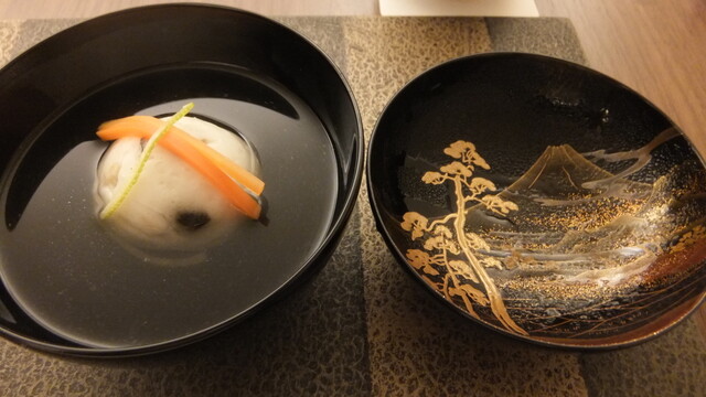昨日はお昼からクラブツーリズムのランチ会に参加。今回は三田にあるミシュラン2つ星日本料理店「晴山」。1週間前に参加した同じ三田のフレンチ「コート・ドール」に続いて2週連続。地下鉄「白金高輪駅」から徒歩8分ぐらいのビル地下1階にある。会費11000円で20名参加。こちらのランチ会でも評判の良いお店。恐らく男性は今回も私一人ではないか。申し込み順でカウンター席からと言うことで申し込みが遅れた私は奥のテーブル席。今回はお品書きがないので若干心もとない。先付は「いくらとほうれん草をクルミで和えた物」。よくかき混ぜて召し上がってくださいとのことでそうする。まろやかな美味しさ。最初から期待通りのスタート。椀物は「帆立の真薯」。蓋を開けると蓋の裏に富士山の絵。器や料理を目でも楽しめる日本料理の嬉しさ。勿論、料理も文句なし。焼物の器も素朴ながら素敵。こちらの器は唐津焼が多いそうだ。「魳とギンナン、薩摩芋の天ぷら」。ギンナンの香ばしさと薩摩芋の天麩羅の甘さが印象に残った。噂通りの美味しさだ。