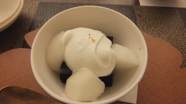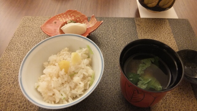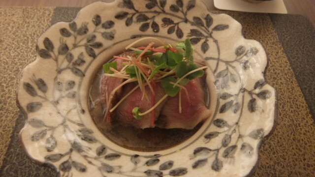4品目は「宮崎牛のローストビーフ」。ローストビーフも美味しくないものも多いが、さすがにこちらの物は違う。肉自体も美味しいし、日本料理的な味付けも一層肉の旨味を引き立たせている。5品目は「芋饅頭に穴子、春菊」。こちらのお料理に共通の何か心を温かくさせるような味。本日の御飯は栗ご飯。いつもは美味しくてもお替りはしないがこの日はお替りをしてしまった。私は赤出汁の濃い目の味は好きではないがこちらの留椀は穏やかな薄味で美味しい。香の物を載せた鯛の器が可愛らしい。デザートは「梨にゼリー、生クリーム載せ」。これが又、抜群に美味しい。沖縄産の何とかという赤砂糖と和三盆を使っているそうだが生クリームとゼリーの相性が絶品。単なるゼリーと生クリームと思ったら大間違い。ここで店主の山本料理長がご挨拶に登場。まだ36歳だったか若いが噂通り好感の持てるお人柄。予約を入れればランチに一人でお伺いしても大丈夫とのこと。通常のランチは、今回よりもかなりお安い。満足至極のランチ会だった。お値段を考えれば、これまで行った日本料理店の中で一番といっても良いと思う。ちょっと残念だったのは今回のコースにお造りが無かったこと。有名店でも美味しいお刺身はめったに、いただけないので、こちらのお造りをいただいてみたかった。ともあれ大満足。