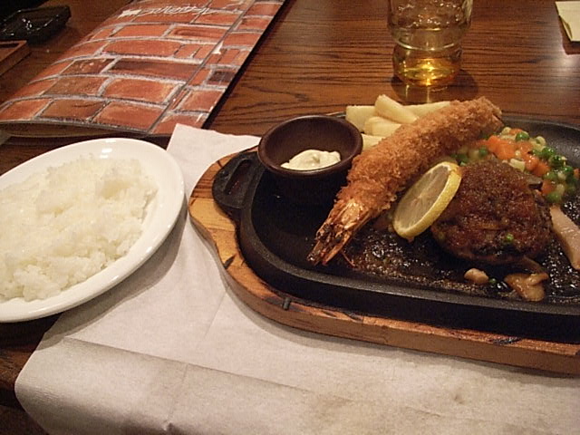 店内は、平日の午後6時頃だったが、お客さんは、私一人。評判のレアの炭焼きハンバーグと海老フライ、味は、まずまず。